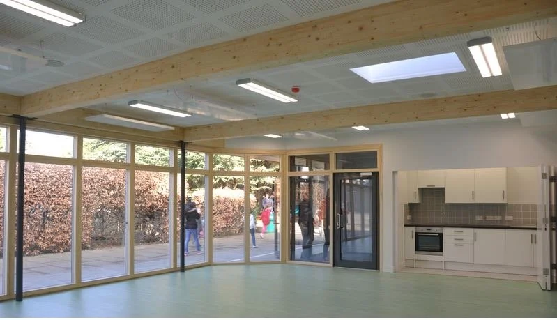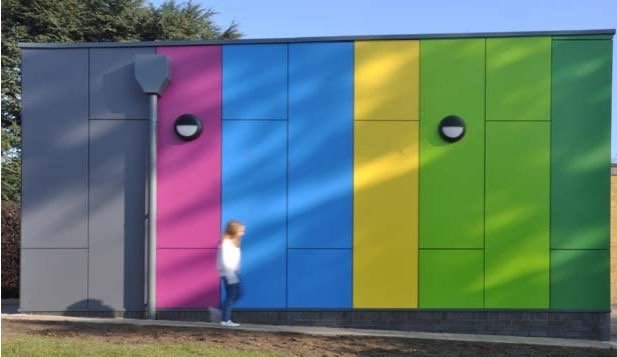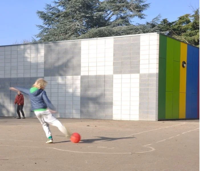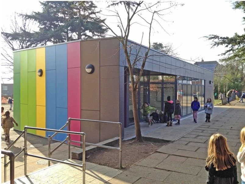 The project at Brookland Primary School in Blackheath aimed to create a dynamic and engaging classroom space, specifically designed for physical activities and arts and crafts. Located adjacent to the playground, the classroom was strategically constructed with interactive blockwork, allowing for various ball sports during playtime. In response to the school's design project feedback, which emphasized the incorporation of color and interactive elements, vibrant cladding was applied to each side elevation. The selection of primary and bold colors not only promotes an uplifting atmosphere within the classroom but also complements the original 1950s school building, seamlessly blending the new addition with the existing architectural style.